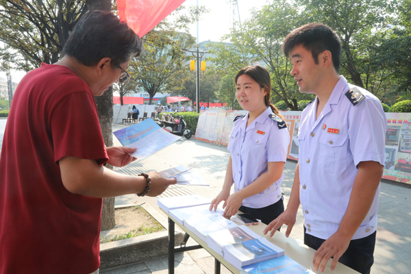 活动期间,通过设置宣传咨询台、悬挂横幅、摆放普法展板等形式,吸引来往市民纷纷驻足咨询,了解税费政策相关知识,对市民提出的具体涉税问题逐个现场答疑解惑,进行耐心讲解。同时,税务人员将编制的税收宣传册发放给市民,让群众能够及时了解税收新政,方便群众查询使用。