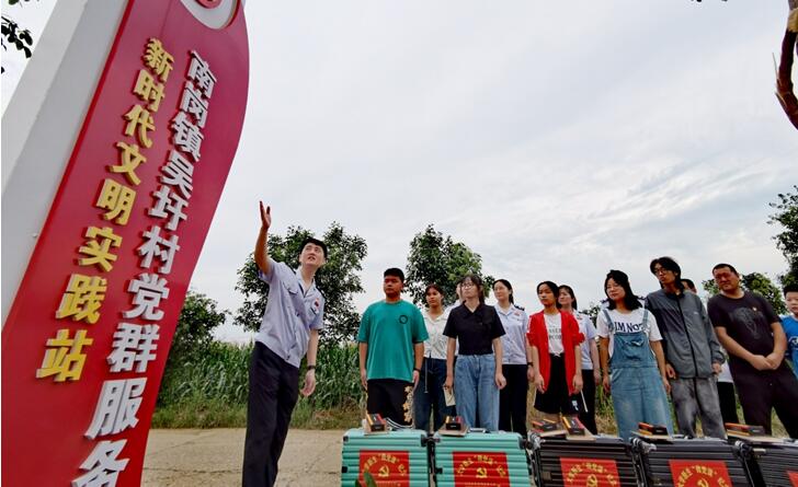 临近傍晚,村里的暑气消散了许多。徐徐微风中,成片的玉米地沙沙作响、绿意盎然,村头“南岗镇吴圩村党群服务中心”鲜红的牌匾旁,印有“大学新生‘微党课’纪念”字样的行李箱等学习用品一字排开,与孩子们喜悦的笑脸相映成趣,成为一道美丽的风景线。