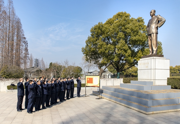 在周恩来总理铜像前,面对鲜艳的党旗,全体党员重温入党誓词,重忆入党初心。“我志愿加入中国共产党,拥护党的纲领……随时准备为党和人民牺牲一切,永不叛党!”铮铮誓言,体现了党员税干们对党的无限忠诚,坚定了勇担使命的初心。
