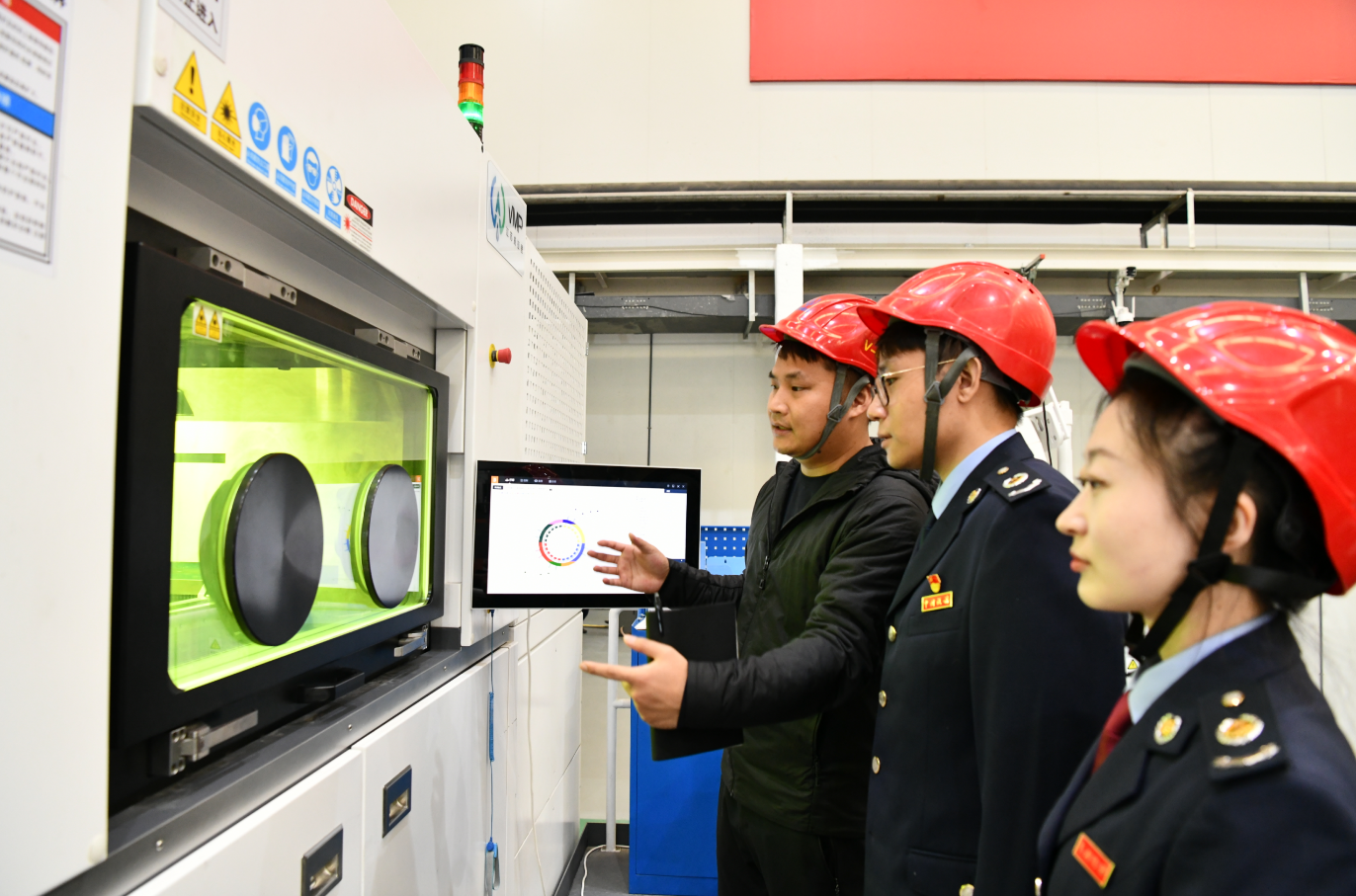 近日,国家税务总局徐州经济技术开发区税务局组织干部走进区域内科创企业,开展研发费用加计扣除政策适用、财务核算等难题的专项辅导,帮助企业合规经营。图为税务干部在一家企业了解技术研发情况。