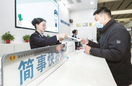 近年来,市政务服务中心深入推进"高效办成一件事"改革,将惠民利企服务落到实处,增强企业、群众的获得感、满意度。图为昨日,我市一位个体工商户在市政务服务中心税务服务窗口"简事快办岗"办理税务事宜。