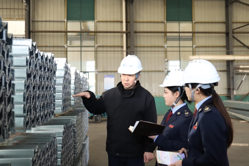 国家税务总局邳州市税务局组织服务队走访制造业企业,征求企业涉税诉求。图为税务干部在一家热镀锌加工企业了解产品生产情况,辅导企业合规适用出口退税政策。