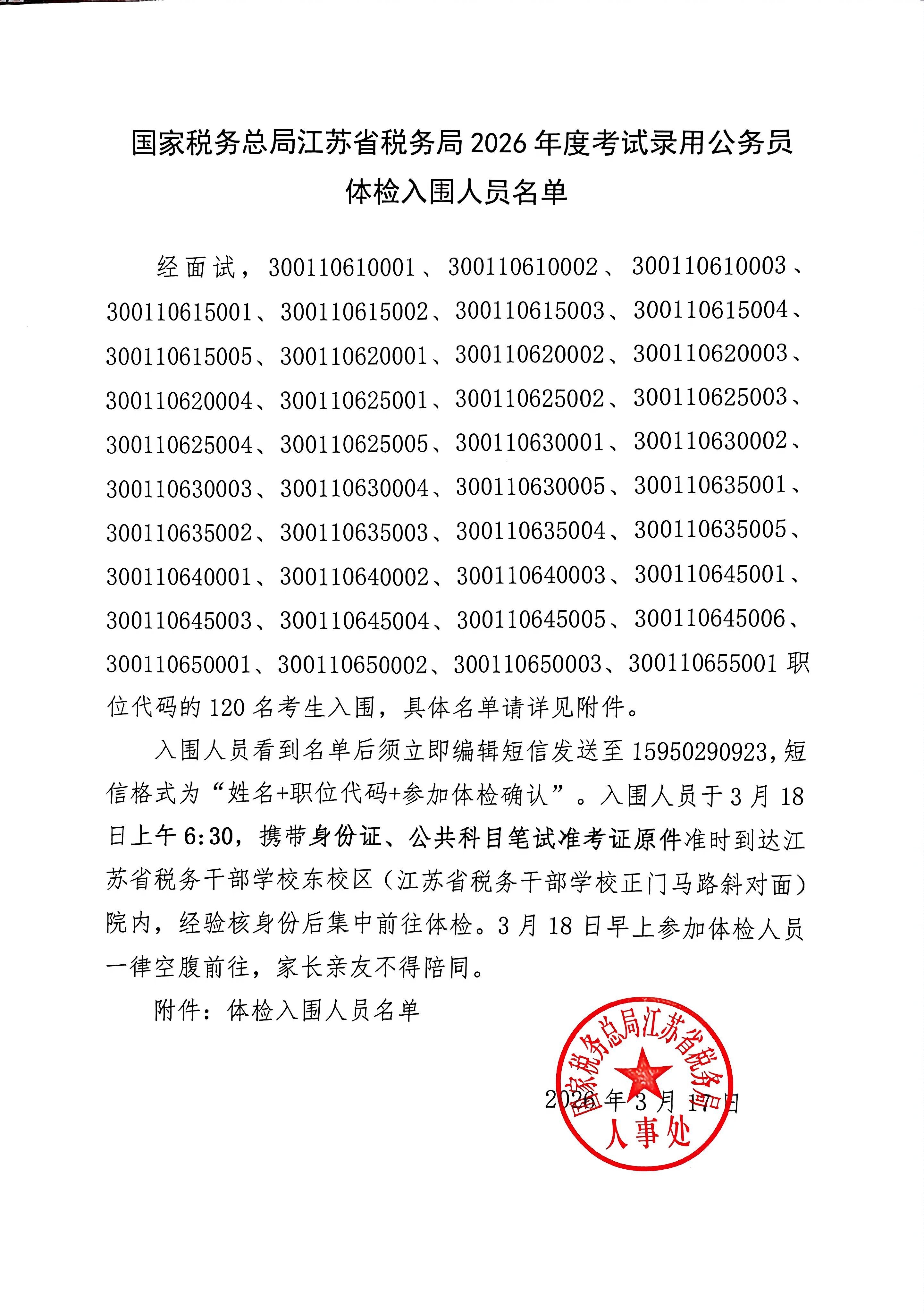 国家税务总局江苏省税务局2026年度考试录用公务员3月17日体检入围人员名单公布如下,请体检入围人员认真阅读注意事项。